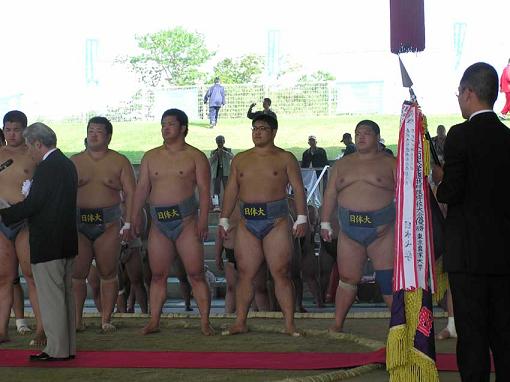 | 5月3日に第47回全国大学選抜相撲宇佐大会が行われ、 近畿大との団体戦、2勝2敗の優勝戦で、 大将の松永六十四君(日本体育大学4年相撲部、平成16年卒)が、 上手投げを決めて、日本体育大学が見事初優勝を勝ち取った。 松永君の応援に相撲部OBの森さん(平成3年卒)、米倉さん(平成3年卒)が、 生月と平戸から、大分まで駆けつけました。 |