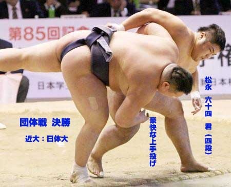 日体大、松永六十四君(猶興館平成14年卒)は個人戦ベスト8。 団体戦決勝は強豪、近大。2対2で大将同士の決戦となり、土俵際渾身、豪快な右上手投げで日体大に18年振り、3回目の優勝をもたらす活躍をしました。 六十四君の応援に平戸から、猶興館相撲部OBの森 豪さん、米倉智晃さん(共に平成3年卒)、大浦孝一さん(平成11年卒)が、東京支部から亀山弘行さん(昭和35年卒)が会場に駆けつけ声援を送りました。ご苦労様でした。 (参照)Yahooニュース |