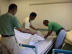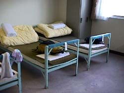 この部屋が隊員の宿泊室です。ベットメーキングを教官から教わっている相川幹事長と関君。