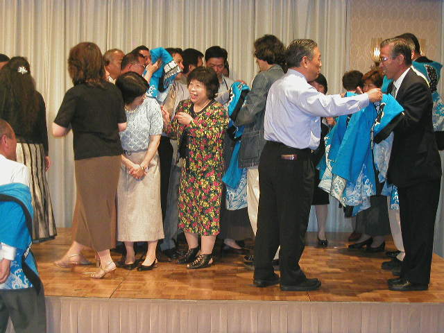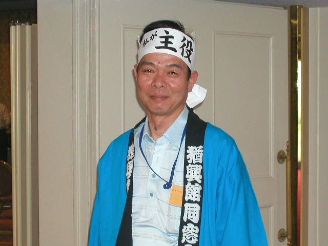 本年度の年次幹事から次年度幹事へ「猶興はっぴ」が引き継がれ、次年度幹事のお披露目と代表の挨拶です。