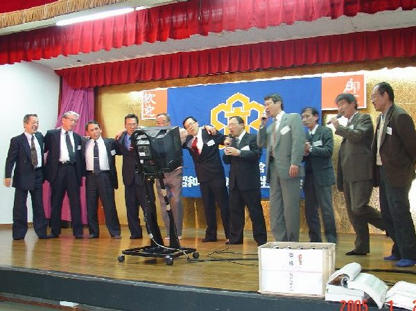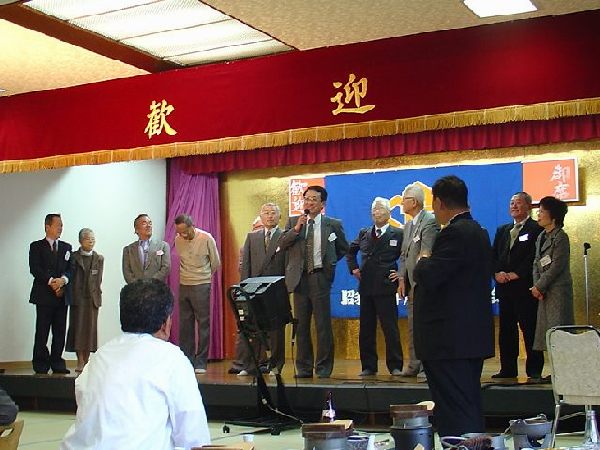 ![]() この人達があってこその同窓会です。 世話人の井上玄一君が恩師への感謝を込めて閉会の挨拶。 代表の柿本親孝君(左端)や大久保順子さんの顔も。 |