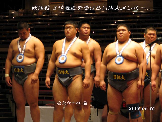 | 上記大会に猶興館出身の松永六十四君(平成16年卒 日本体育大学4年生)と中野実君(平成17年卒 国士舘大学3年生)が出場し大健闘しました。特に松永君は日体大のベスト4進出に貢献し又個人戦でもベスト8入りの活躍でした。 同大会には六十四東京応援団長の亀山弘行さん(35年卒)浜辺前副会長、伊崎前幹事長及び青木副会長が応援に参加しました。 |