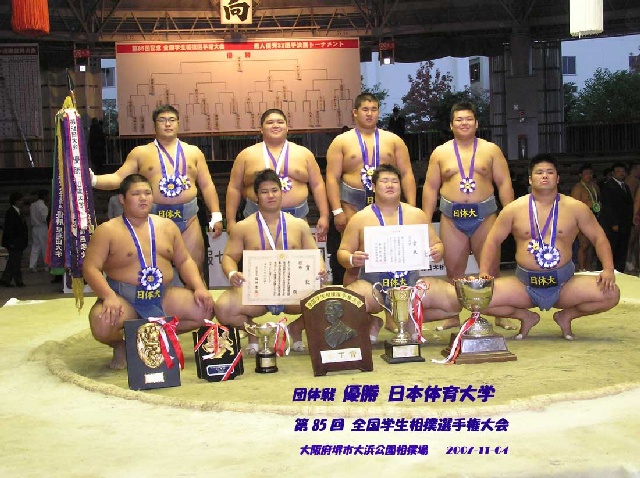 日体大、松永六十四君(猶興館平成14年卒)は個人戦ベスト8。 団体戦決勝は強豪、近大。2対2で大将同士の決戦となり、土俵際渾身、豪快な右上手投げで日体大に18年振り、3回目の優勝をもたらす活躍をしました。 六十四君の応援に平戸から、猶興館相撲部OBの森 豪さん、米倉智晃さん(共に平成3年卒)、大浦孝一さん(平成11年卒)が、東京支部から亀山弘行さん(昭和35年卒)が会場に駆けつけ声援を送りました。ご苦労様でした。 (参照)Yahooニュース |