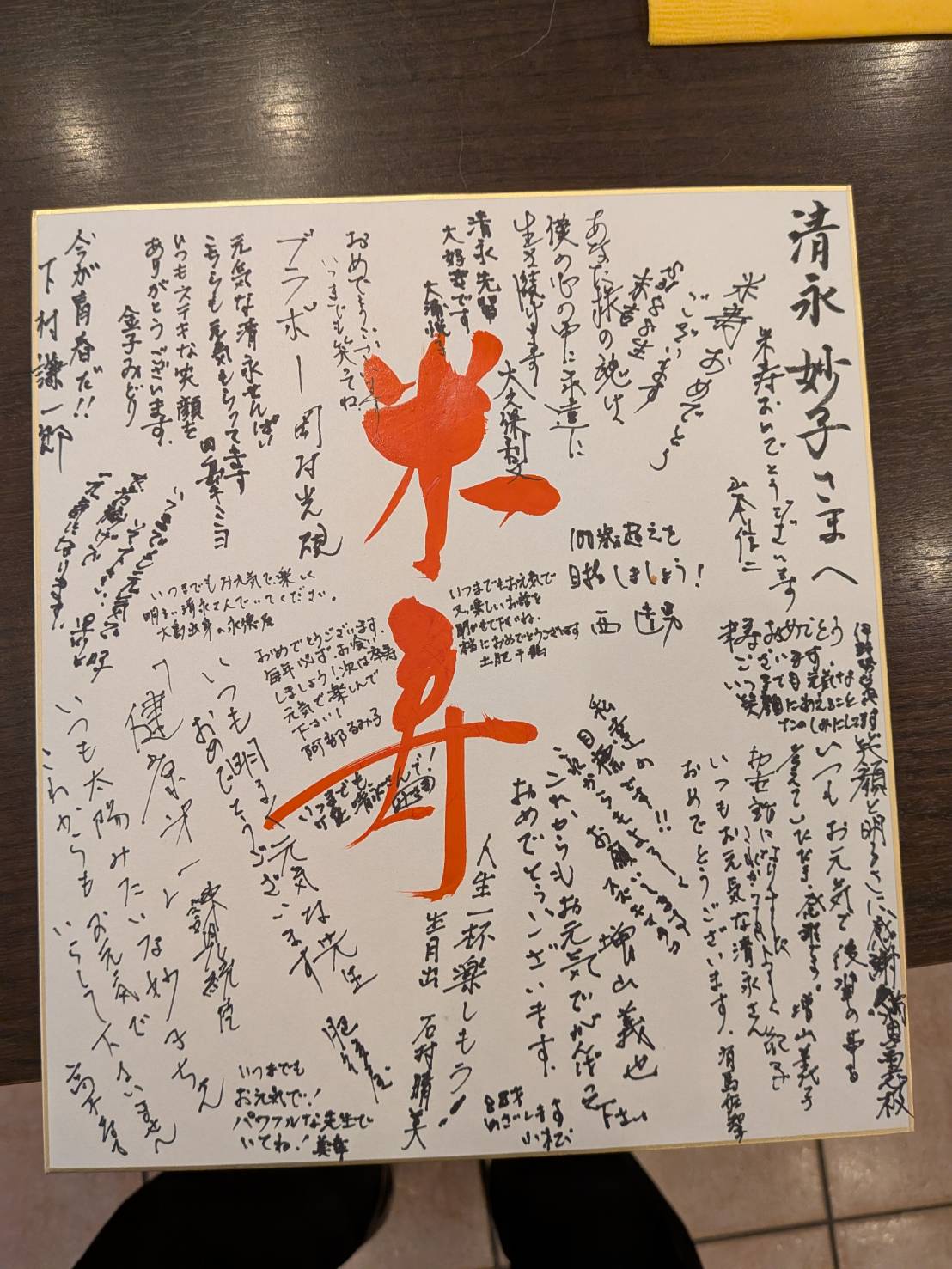 閉会の挨拶の前に金子みどりさんは達筆な垂れ幕について説明しました。清永さんの米寿を祝う垂れ幕は狭山市在住の同窓生S58年卒の西村五子さんが無償で書いてくださり、色紙の中心にも〈米寿〉と朱色で入れて下さいました。本当に有り難うございました。改めて皆さんの善意によって支えられている女子会だと感謝の気持ちで一杯になりました。